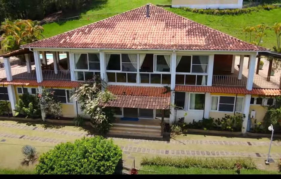 A propriedade fica dentro de um condomínio cercado por natureza, e possui mil metros quadrados construídos, com varanda, cinco quartos, piscina, espaço gourmet e um anexo para hóspedes. O terreno tem seis mil metros quadrados, com uma área de mata e um lago.